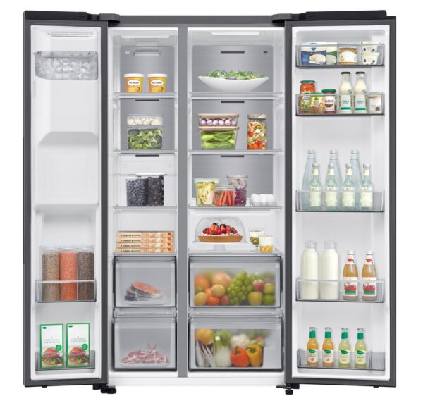 Embrace the art of modern refrigeration with the Samsung 91cm Side by Side American Fridge Freezer. This stylish unit not only showcases a contemporary silver finish but also expertly balances space and functionality. Its innovative design features thinner walls, providing you with more storage capacity for your groceries and essentials without compromising on style.